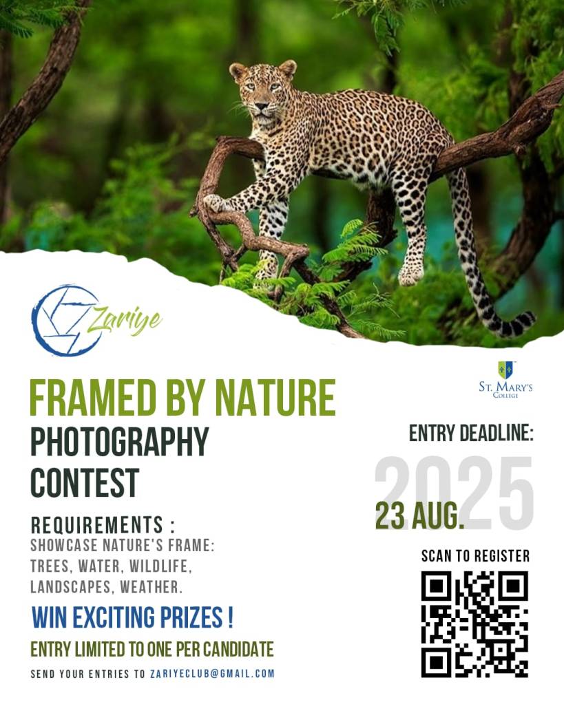 Announcing our zariye external event for this semester, ‘Framed by nature’ is a photography competition open for everyone in Mary’s. With the theme of nature photography, please do send in your entries and two winners would be announced on the event on 25th, who’ll also be given exciting cash prizes😉